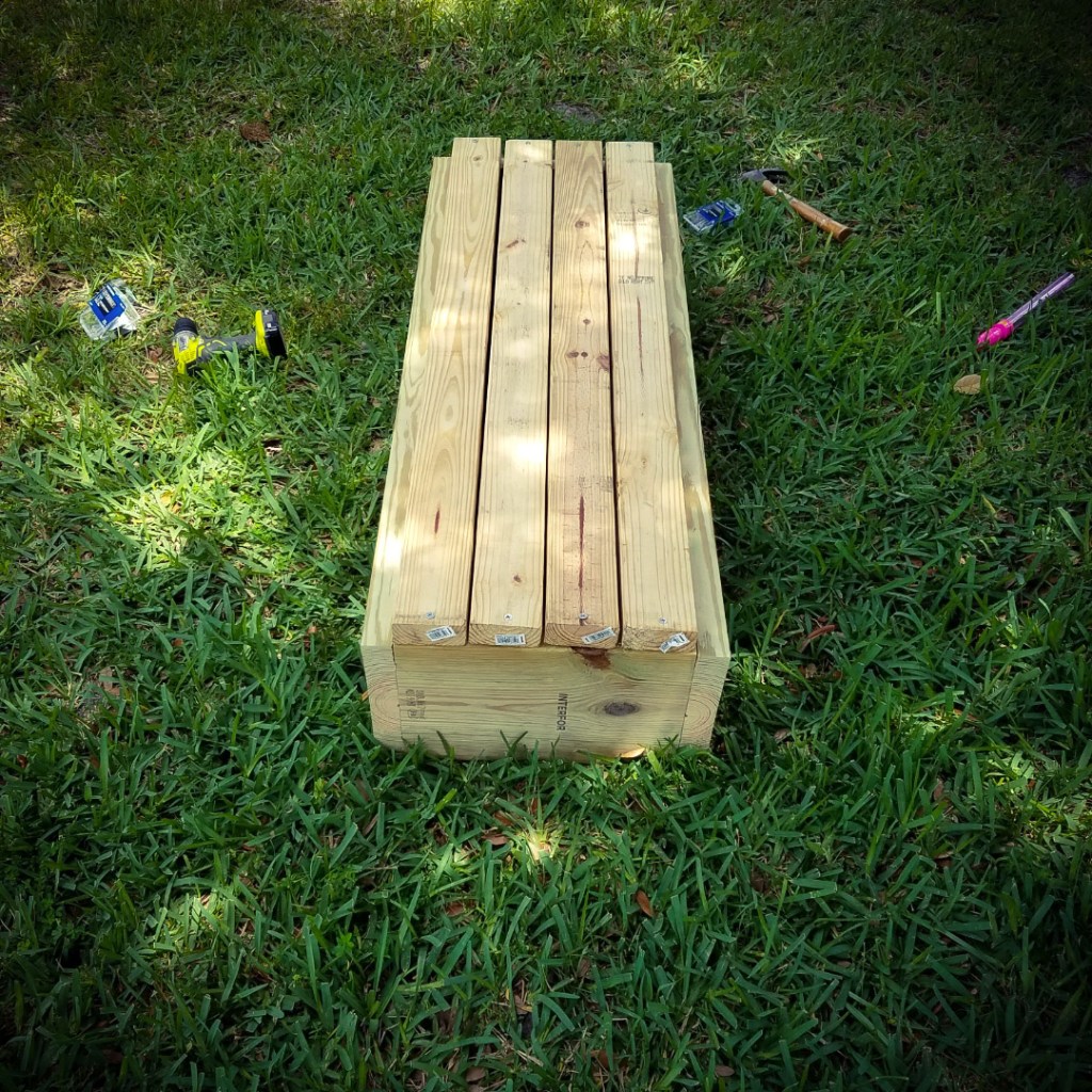 Next, I took the 48″ 2x4s and joined them to the short side panels creating the bottom. They will not fit flush together. The small spaces between the boards allow water to drain out of the bottom. Keep that in mind too when you are initially filling it with soil or changing out the soil entirely as some will fall out of the bottom if you choose not to put some type of liner in it.